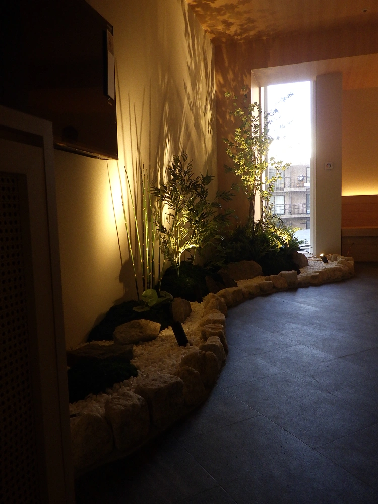 光と緑が調和する明るく洗練されたリラクゼーショスペース。色とりどりのグリーンが空間に自然な奥行きを生み出します。
